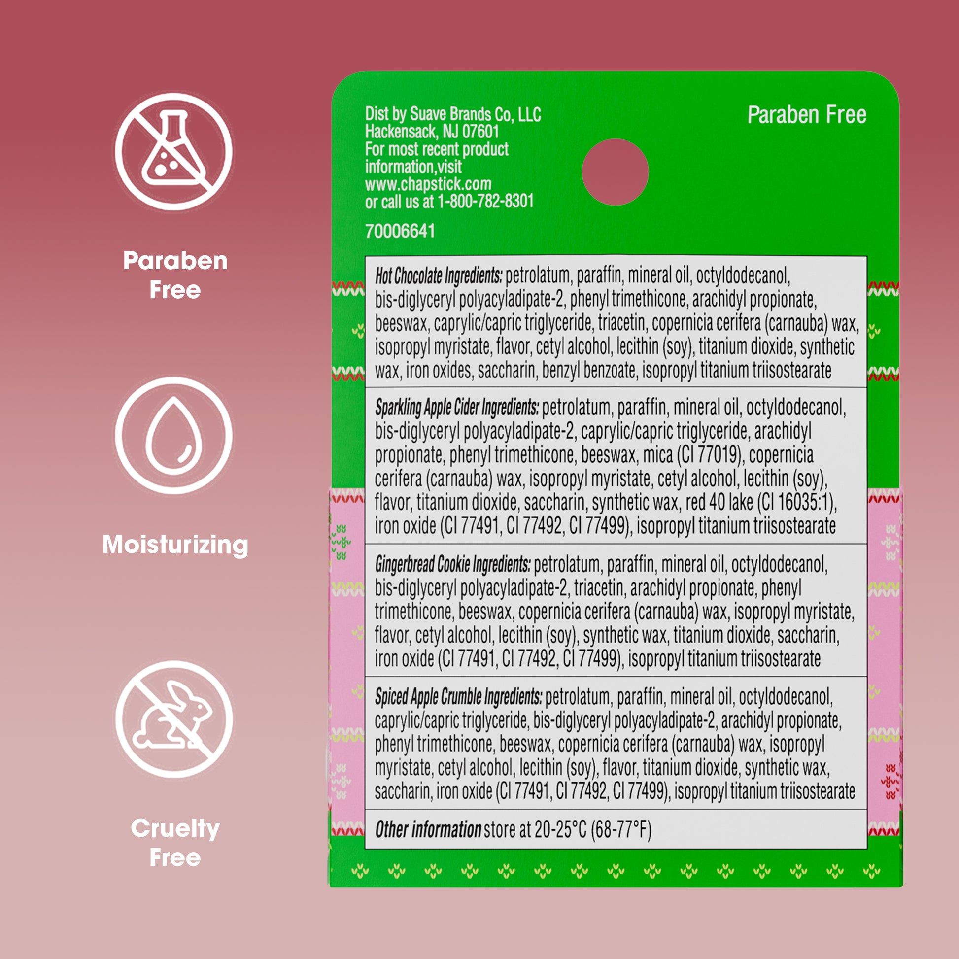 Celebrate the warmth and spirit of giving this holiday season with six flavored ChapSticks in a sweater–inspired box. Each flavored lip balm delivers smooth, soothing moisture to keep lips soft and sweet all year long
