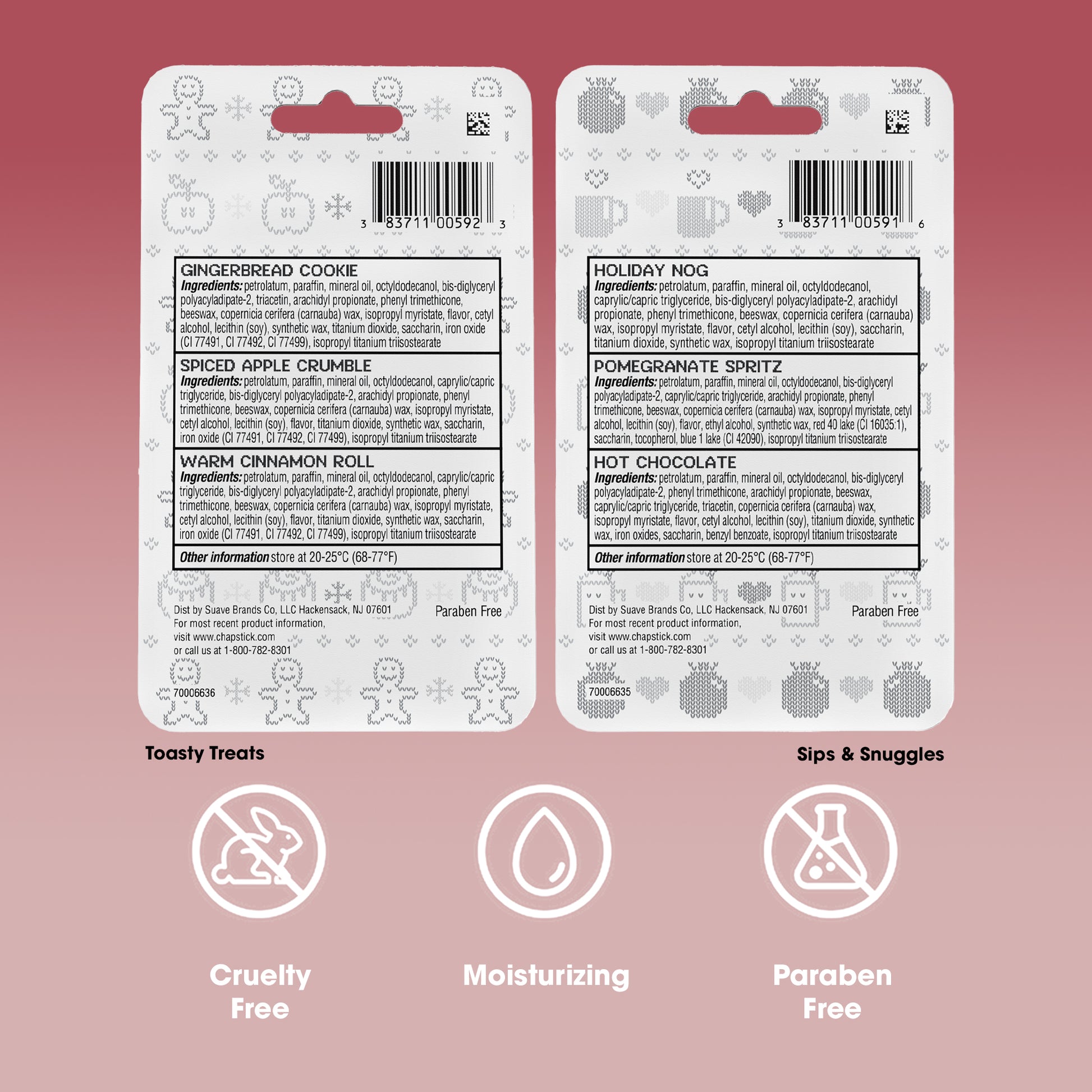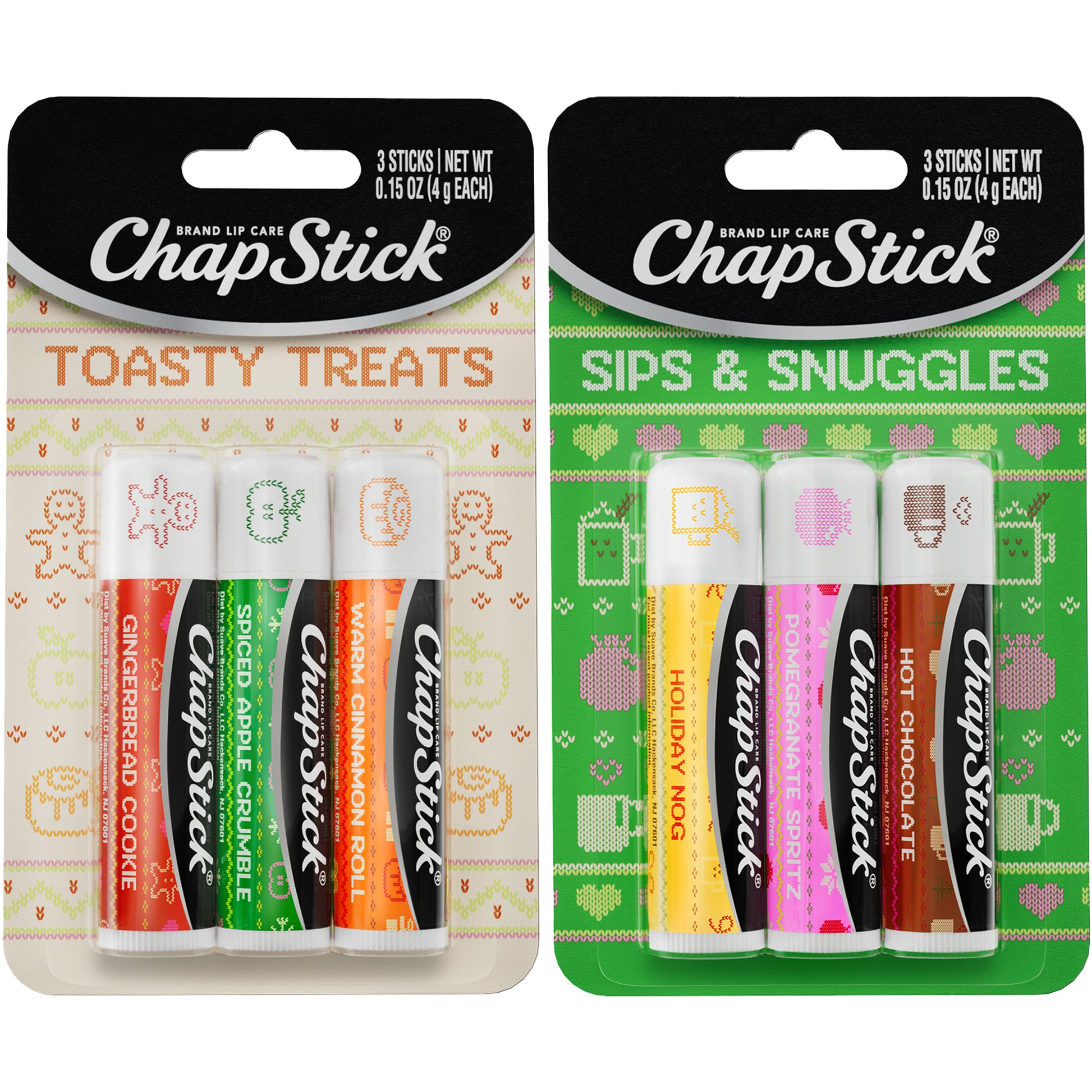 Celebrate the warmth and spirit of giving this holiday season with flavored ChapSticks in tiny sweaters you can hang on the tree. Each warm and cozy lip balm delivers smooth, soothing moisture to keep lips soft and kissable.